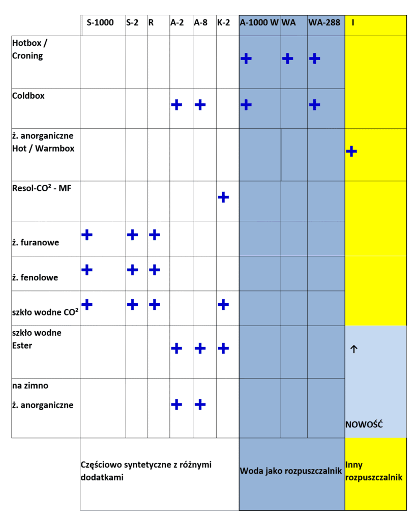 W ofercie znajdują się również środki pomocnicze takie jak n.p. środki smarno- poślizgowe w aerozolu, środek poprawiający wybitnie płynność masy utwardzanej szkłem wodnym RESIN, środek poprawiający wybijalność rdzeni utwardzanych szkłem wodnym ZERFALLSFÖRDERER i wiele innych.